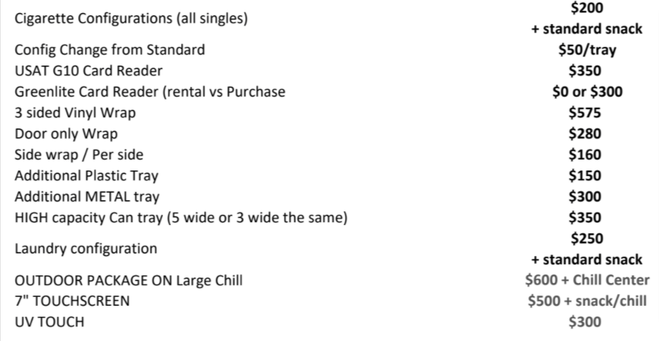 Quickly review our list of additional parts and features you can add to any machine. This prices are in addition to the cost of the machine.