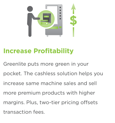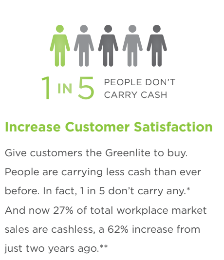 Greenlite makes paying easy. Don't miss a sale because a customer didn't have the exact amount of dollars and change. By letting the customer pay via card, they are more satisfied, you reduce operating costs, and you also increase profit.
